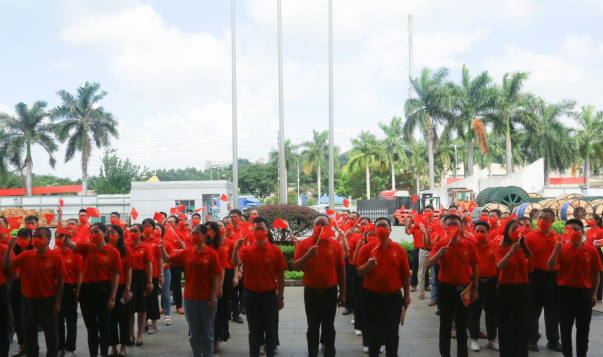 盛夏七月,热情似火!yh86银河国际公司已是党旗飘扬,处处洋溢着喜庆祥和的气氛。当日上午,身穿“中国红”T恤的党员等参会人员有序入场,列队数字“100”庆祝图案,表达对中国共产党的无限热爱。随着主持人一声令下,伴随着激昂雄壮的国歌声,护旗手奋力将鲜艳的五星红旗抛向天空,国旗迎着清晨第一缕阳光冉冉升起,全体人员庄重注视国旗,高唱国歌,脸上写满了骄傲与自豪。